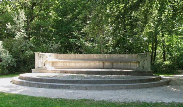 Каменная скамья, расположенная в Южной части Английского сада в немецком городе Мюнхен, была установлена в 1838 году на правом берегу ручья Айсбах, на месте храма Аполлона. Этот храм был построен в 1789 году, но уже к началу XIX века он разрушился из-за того, что был выполнен из дерева и стал постепенно сгнивать. На круглом каменном возвышении – бывшем фундаменте храма Леон фон Кленце решил поставить каменную скамью, снабдив ее надписью на немецком языке, гласящей: «Здесь, где вы бродите, были раньше лишь лес да болота». Недалеко от скамьи находится знаменитая постройка Английского сада – Моноптер.