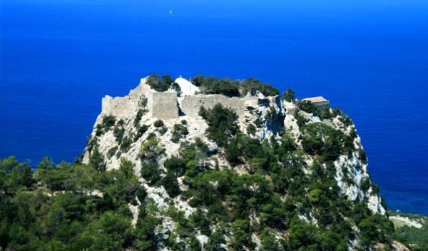 "Замок Монолитос был построен Рыцарями-Иоаннитами для защиты острова от чужеземных захватчиков и пиратов. При взгляде на замок создаётся впечатление, что он как будто "вырастает" прямо из скалы, и это не удивительно- слово "Монолитос" переводится с греческого языка как "камень". Сейчас этот некогда величественный замок разрушен, сохранились только водосборники, наружные стены и небольшая часовня Святого Георгия. С замка открывается потрясающий вид на море и соседние островки. Под горой с южной стороны расположен небольшой пляж и кафе, где можно отдохнуть и восстановить силы после утомительного подъема и прогулки."