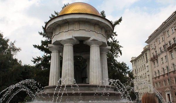 "Фонтан-ротонда "Наталья и Александр" установлен в честь двухсотлетия Александра Сергеевича Пушкина.Фонтан установлен недалеко от церкви Вознесения Господня за Никитскими воротами. Именно здесь Александр Сергеевич Пушкин венчался с Натальей Николаевной Гончаровой.Фонтан-ротонда построен по проекту архитекторов Михаила Белова и Максима Харитонова. Скульптурная композиция выполнена скульптором Михаилом Дроновым.По мысли архитекторов, новый памятник должен был гармонично сочетаться с архитектурным образом знаменитой церкви. Влюбленная пара – Александр и Наталья – окружена колоннами, которые венчает купол, покрытый специальным составом, имитирующим золото.Памятник привлекает множество влюбленных пар и молодоженов, которые приезжают сюда для свадебных фотосессий."
