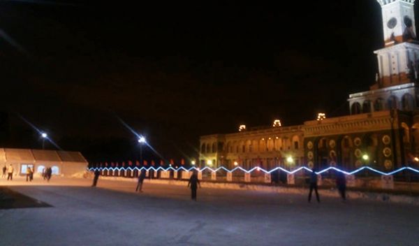 Открытый каток на территории Северного речного порта г.Москвы. Там, где летом люди спешили на посадку на прогулочные суда, зимой по ледовым дорожкам не спеша скользят пары и носятся дети.